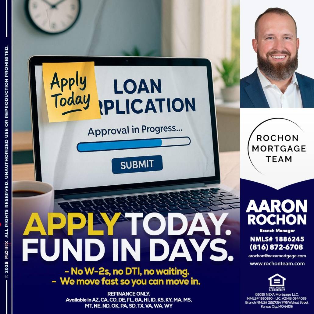 APPLY TODAY - Aaron Rochon -Branch ManagerHi, my name is Aaron Rochon. I’m a Loan Officer with NEXA Mortgage LLC., offering personalized mortgage solutions, fast customized quotes, great rates and service with integrity.
