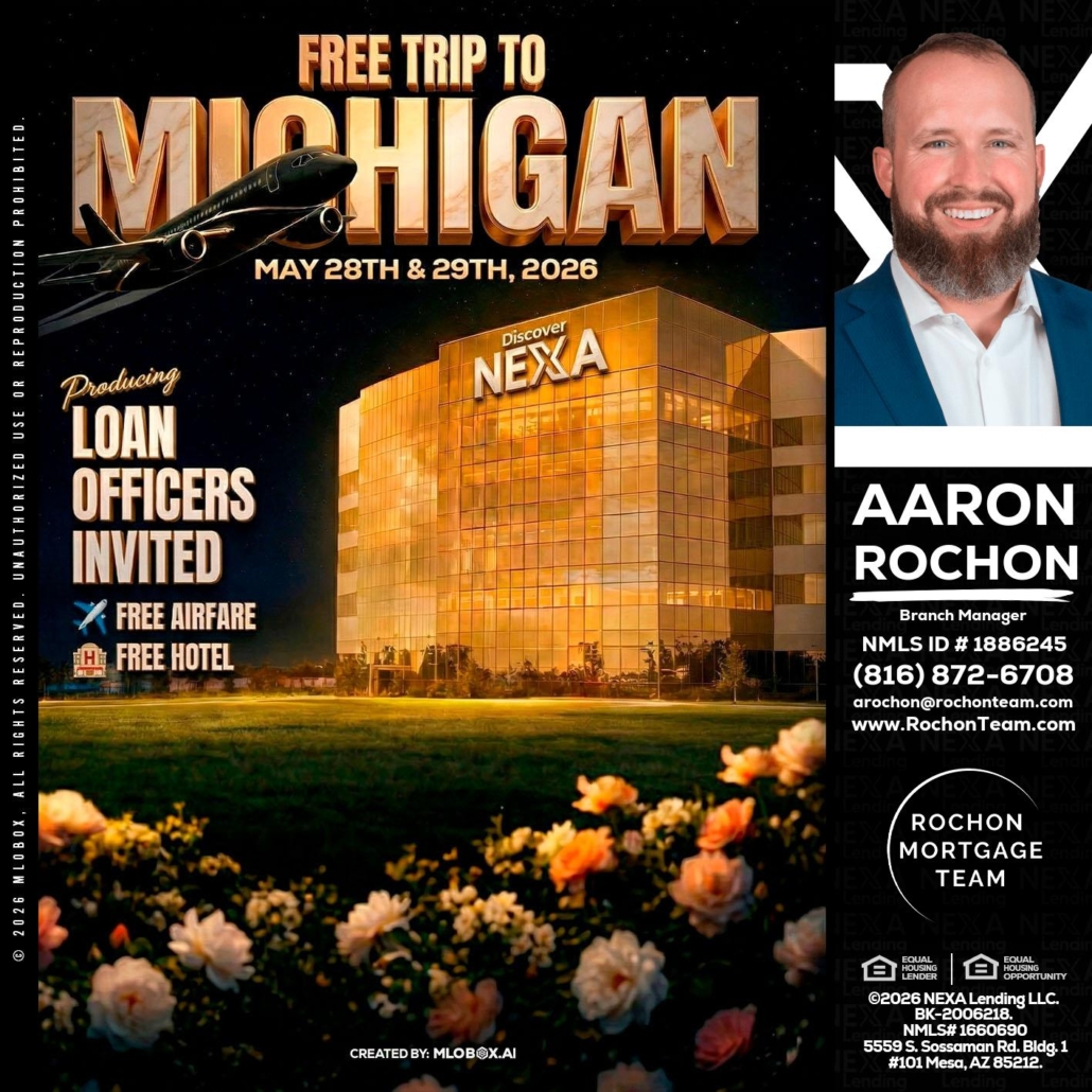 FREE TRIP TO MICHIGAN - Aaron Rochon -Branch ManagerHi, my name is Aaron Rochon. I’m a Loan Officer with NEXA Lending LLC., offering personalized mortgage solutions, fast customized quotes, great rates and service with integrity.
