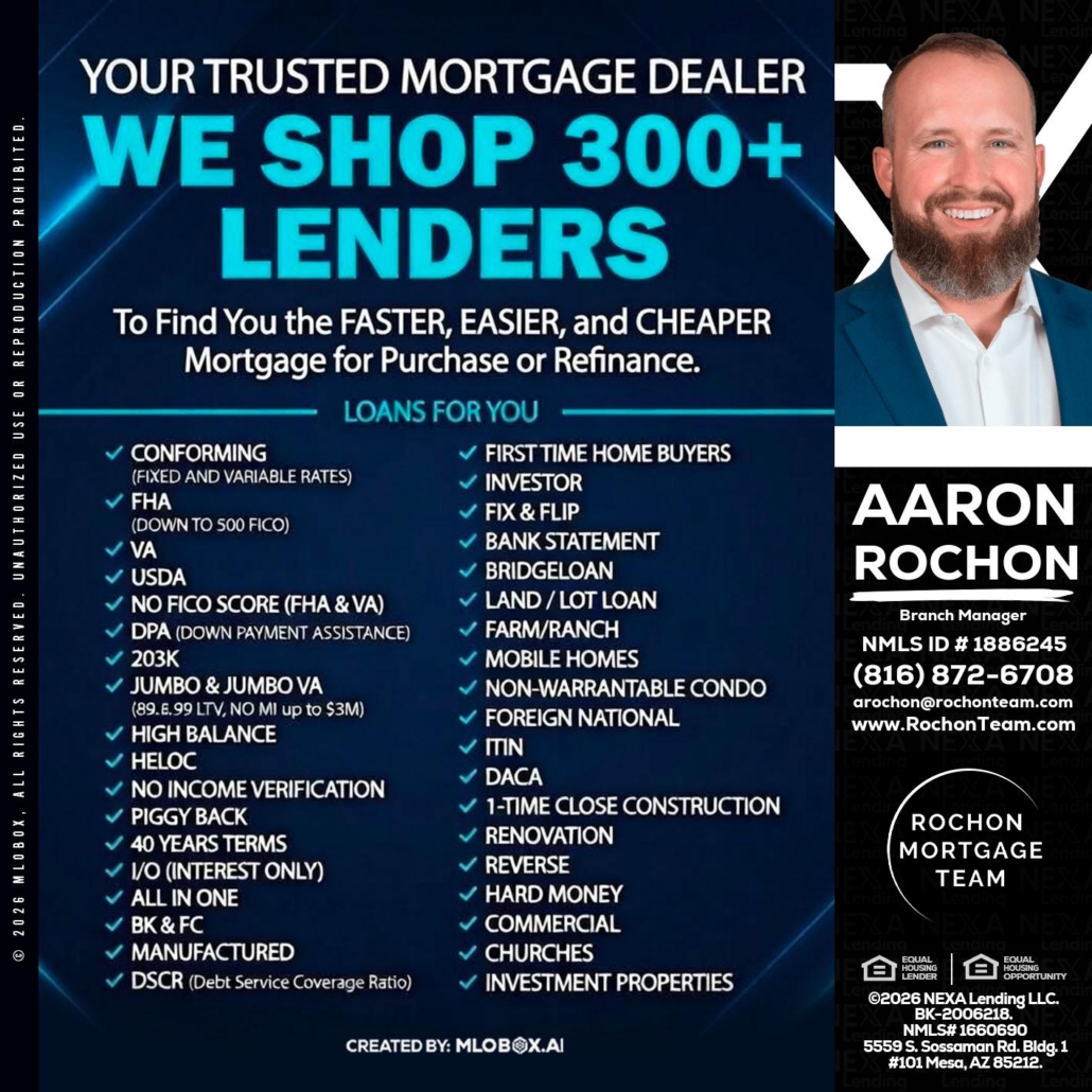 we shop 300 + lenders - Aaron Rochon -Branch ManagerHi, my name is Aaron Rochon. I’m a Loan Officer with NEXA Lending LLC., offering personalized mortgage solutions, fast customized quotes, great rates and service with integrity.
