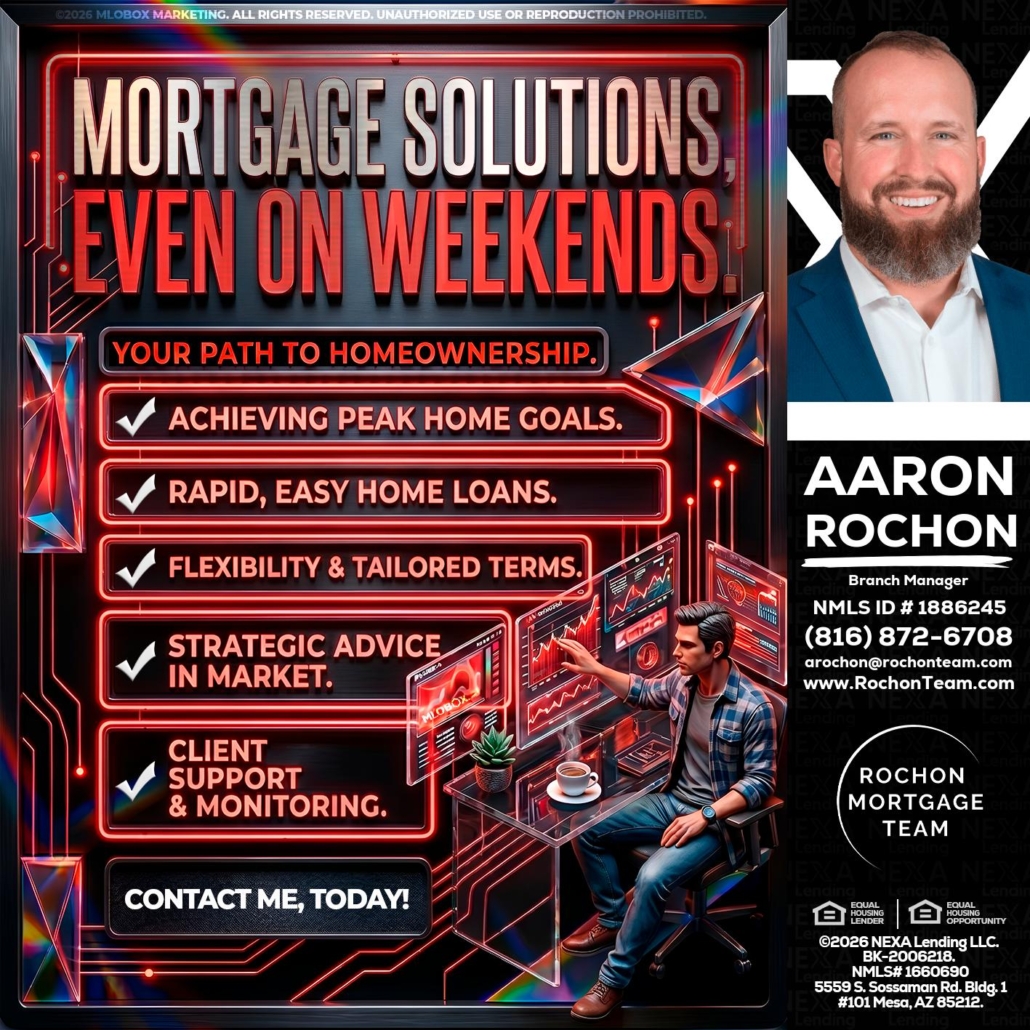 WEEKEND SOLUTIONS - Aaron Rochon -Branch ManagerHi, my name is Aaron Rochon. I’m a Loan Officer with NEXA Lending LLC., offering personalized mortgage solutions, fast customized quotes, great rates and service with integrity.